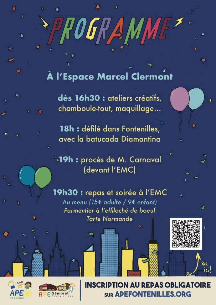 Vous avez reçu un flyer par le biais des cartables de vos enfants (ou vous allez bientôt le recevoir), avec les informations relatives à l'inscription à la soirée, ainsi que le détail du programme de la journée.