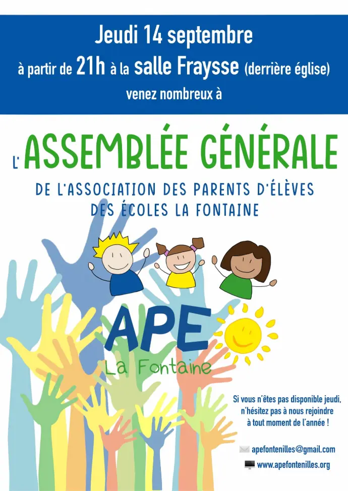 3/ jeudi 14 septembre à 21h à la Salle Fraysse (derrière l'église) se tiendra notre assemblée générale à laquelle - en tant que parents d'élève sur La Fontaine (maternelle et/ou élémentaire)- vous êtes conviés.