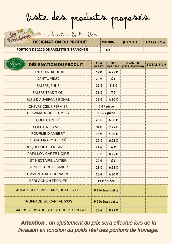 - Consultez la liste des fromages : Cette année nous avons du fromage à raclette proposé par Les Frencheese